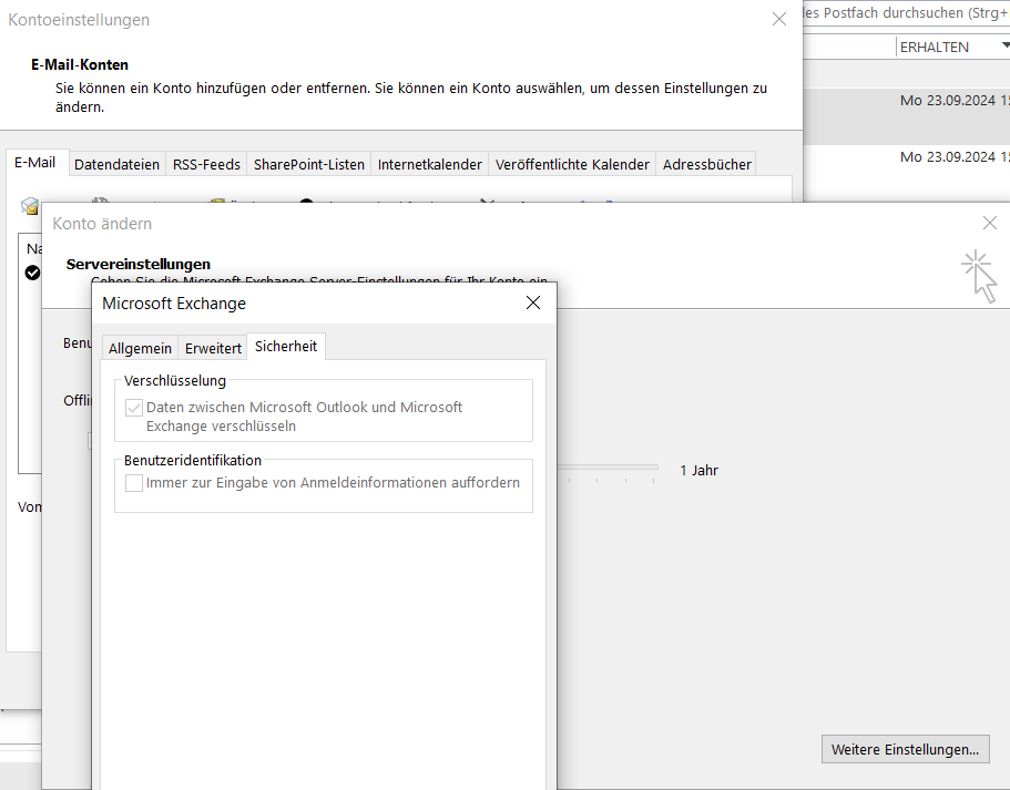 In Outlook 2016 sind die Microsoft Exchange Sicherheitseinstellungen ausgegraut und sehen wie in angehängten Screenshot aus.