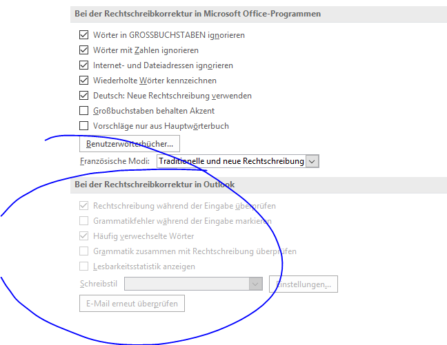 ich hab ein etwas komisches Problem mit Outlook 2016 64bit (Standalone Version meines Exchange-Anbieters) unter Windows 10 Home. Und zwar möchte ich die Rechtschreibprüfung während der Eingabe deaktivieren - aber der ganze Optionsbereich ist ausgegraut und inaktiv. Lediglich der Bereich darüber (für MS Office Programme) ist aktiv. Ich habe parallel noch PowerPoint, Word und Excel aus meiner Office 2010 installiert, falls das vllt einen Zusammenhang hat ...