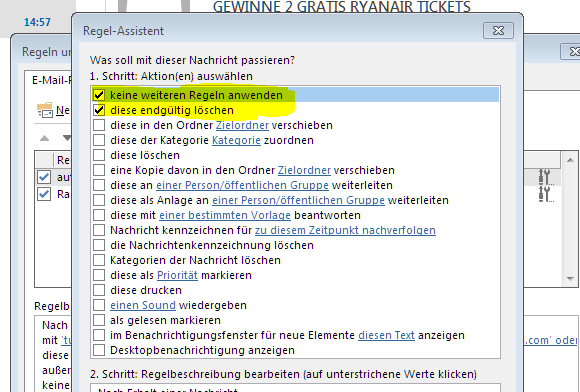 2. wenn ich "diese endgültig löschen" wähle, dann erfolgt automatisch und nicht änderbar die Auswahl von "keine weiteren Regeln anwenden".