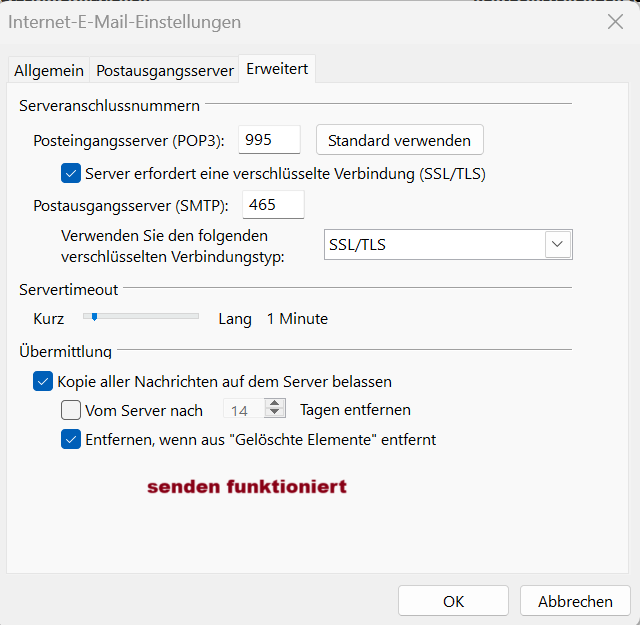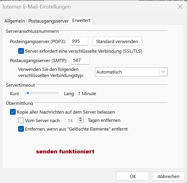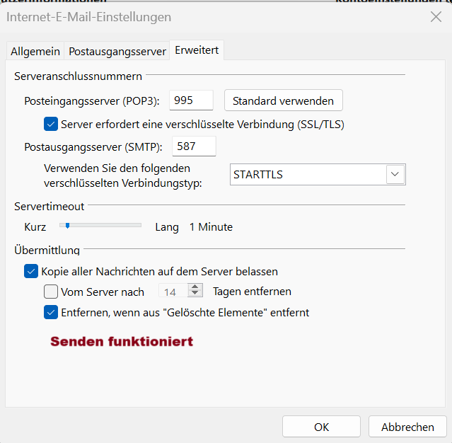 Versenden geht mit beiden Einstellungen, aber jetzt werden keine emails runtergeladen...