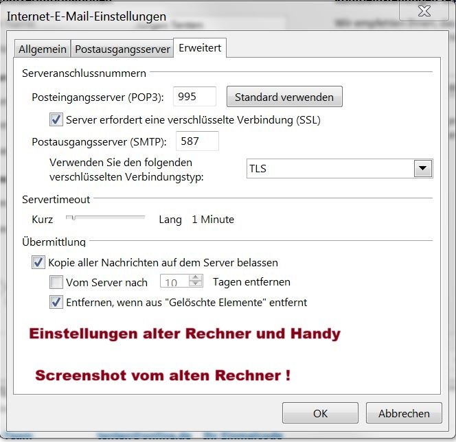 hab sowohl die Einstellungen, die Outlook vorgeschlagen hat, als auch die Einstellung von Handy und altem Rechner getestet,