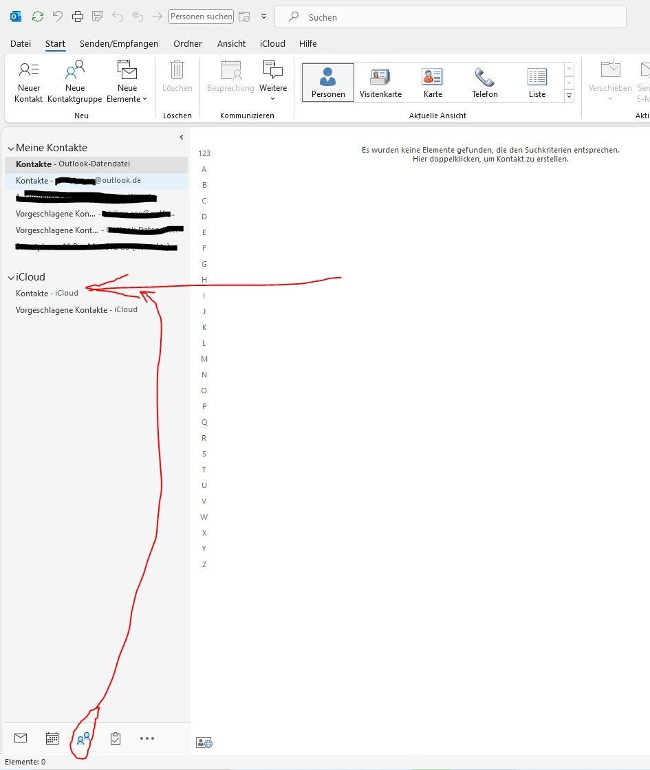 Allerdings werden mir in Outlook 365 keinerlei Kontakte angezeigt. Ich habe auch überhaupt kein Adressbuch das "iCloud" heißt.