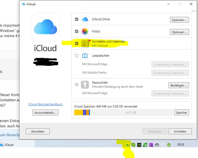 Danach habe ich auf "Anwenden" geklickt und es wurden auch optisch sichtbar alle möglichen Informationen übertragen. Am Ende kam der Hinweis, dass Outlook konfiguriert wurde, um die Kontakte und den Kalender aus iCloud zu verwenden. (siehe Screenshot)