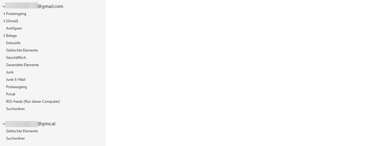 Ich habe das Outlook geöffnet und es werden nicht die accounts angezeigt, sondern ein Eingabebefehl des Passwortes für das Standardkonto (siehe Anhang 1)). Nach der Eingabe kommt die Meldung, dass das Passwort falsch sei (siehe Anhang 2)). Das Passwort ist aber richtig, da ich mich mit diesem im Web auf der gmx-Seite einloggen kann. Beenden kann ich diesen Dialog nur mit dem Task Manager. Es wird auch darauf hingewiesen, dass es diesen account in Dokumente – Outloodateien nicht vorhanden ist. Es sind auch wirklich keine pst- und ost-Dateien vorhanden (siehe Anhang 3)) Nach mehrmaligen Versuchen ist es mir mit einem anderen account dann doch gelungen (wiederum mehrere Eingaben des Passwortes – sah aber anders aus als beim ersten account. Davon habe ich aber leider keinen Screenshot.). So sieht mein Outlook jetzt aus (siehe Anhänge 4) u. 5)). Die ersten beiden accounts haben den gleichen Namen und bei diesem account fehlen z. B. die Unterordner „Posteingang“, „gesendet“, „Spamverdacht“ usw. Bei zwei weiteren accounts sind alle Unterordner vorhanden. Bei den accounts, wo keine Unterordner angezeigt werden, bekomme ich eine Fehlermeldung (siehe Anhang 6)). Ein account wird überhaupt nicht angezeigt.