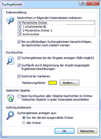 Ich habe dannach im Internet eine Anleitung gefunden, das ich Outlook schliessen soll und die Indizierungsoptionen öffnen sollte dannach auf ändern die Häkchen rausnehmen, auf Erweitert klicken und bei Problembehandlung Index löschen und neu erstellen anschliessend wieder auf ändern und die vorhergesetzten Häkchen wieder reinmachen.