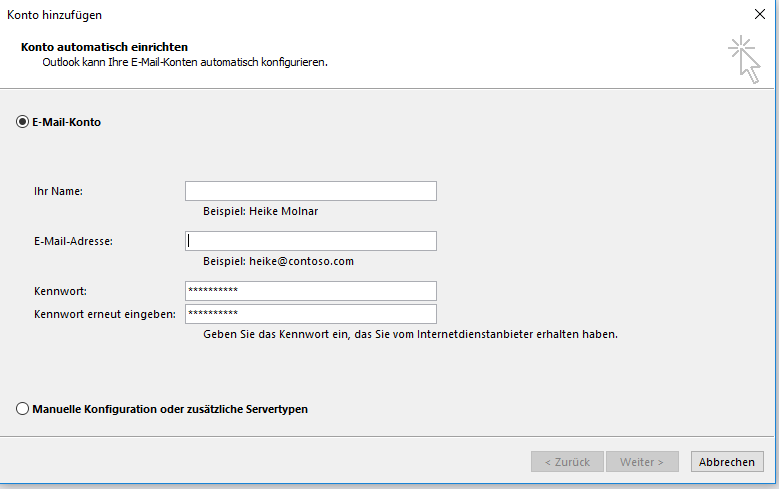 Da gibt es ja die Möglichkeit : "Konto automatisch einrichten".