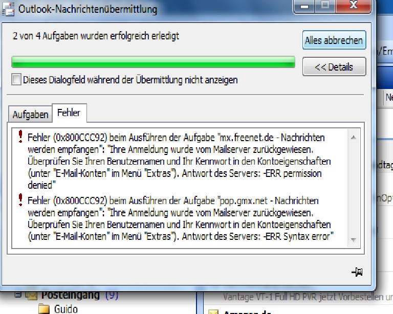 Unter Win7 warte ich ebenfalls bis die Masken zur Passworteingabe erscheinen, gebe diese dann brav wie immer ein. Allerdings erhalte ich dann immer folgende Fehlermeldung (siehe Grafik im Anhang). Wenn ich dann auf "Alles abbrechen" klicke und im Anschluß daran auf "Senden/Empfangen" klicke werden die Server anstandslos abgerufen und die Mails trudeln ein. :freakWARUM????