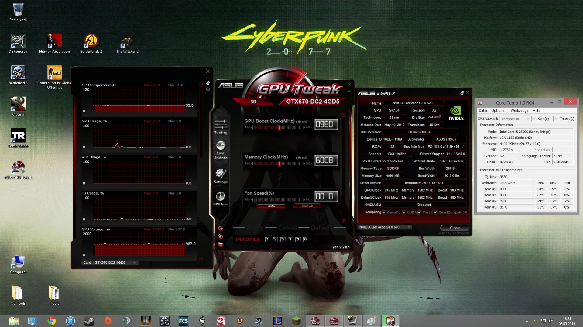 natürlich sollte die VDDC spannung angepasst werden. die spannung der ASUS GTX 670 DCU2 sollte unlocked sein.