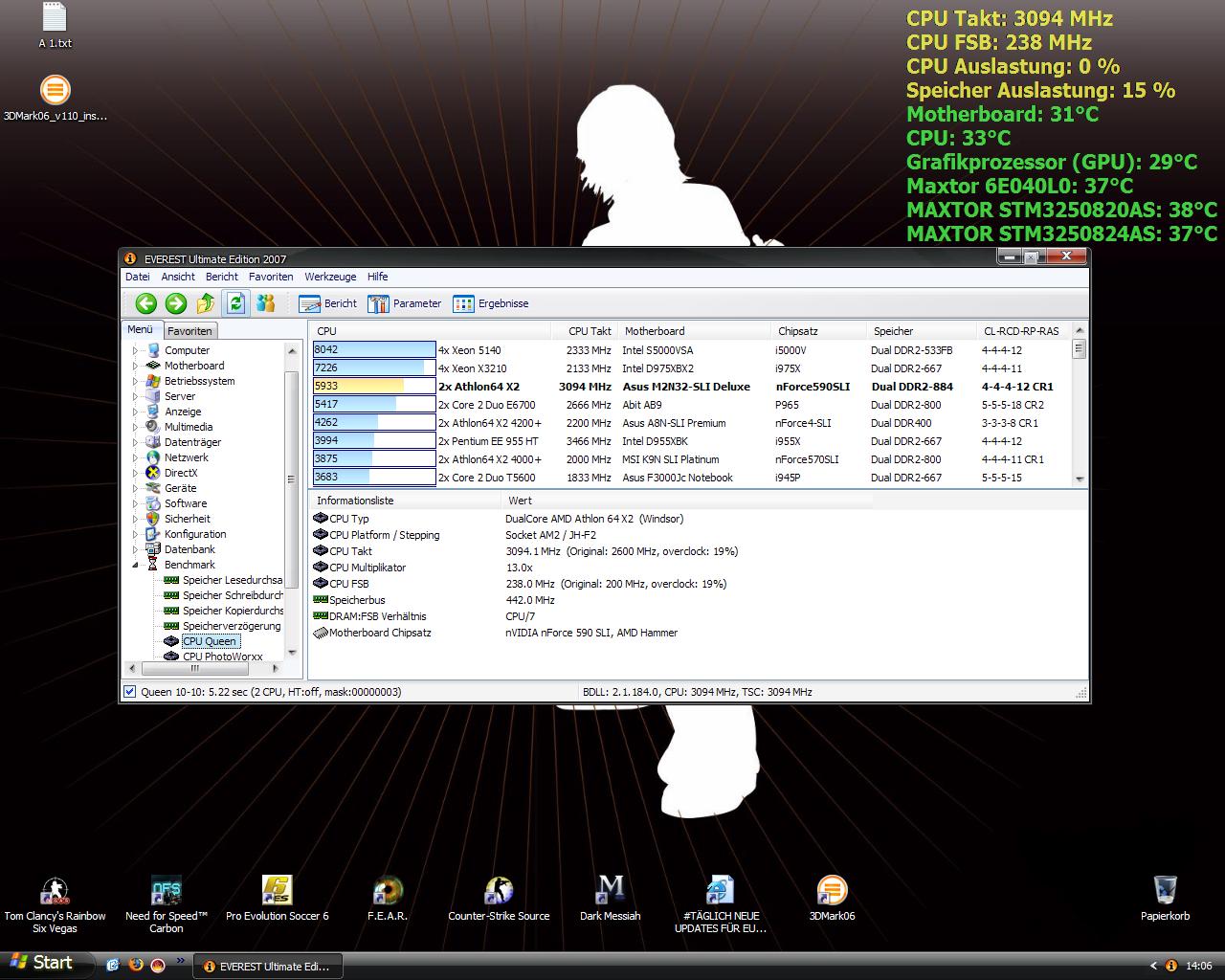 Die Benchmarkegebnisse verwirren mich allerding. Aquamark war ich mit ~ 109.000 Punkten ~ 10.000 Punkte besser als vor dem Clocking, bei 3DMark06 war ich jedoch mit 6008 Punkten ~500 Punkte schlechter