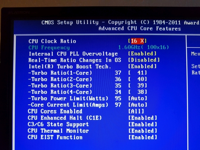 Merkwürdigerweise ist es aber so, dass ich bei dem i5-2500 den Multiplikator im BIOS zwischen 16 und 40 einstellen konnte und zusätzlich den Multiplikator für die verschiedenen Turbo-Modi.