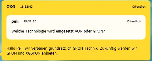 Ich werde es so halten, dass das Modem möglichst nicht angedübelt wird, was genau dann benutzt wird wird mit dem tatsächlichen Anbieter ausgehandelt. Der Netzabschluss ist schließlich als passiv festgelegt, was hoffentlich auch so bleibt. Wobei es bei mir einfacher wäre, das vorhandene Ethernetkabel zu benutzen. Mal sehen. Erstmal muss der Bagger kommen.