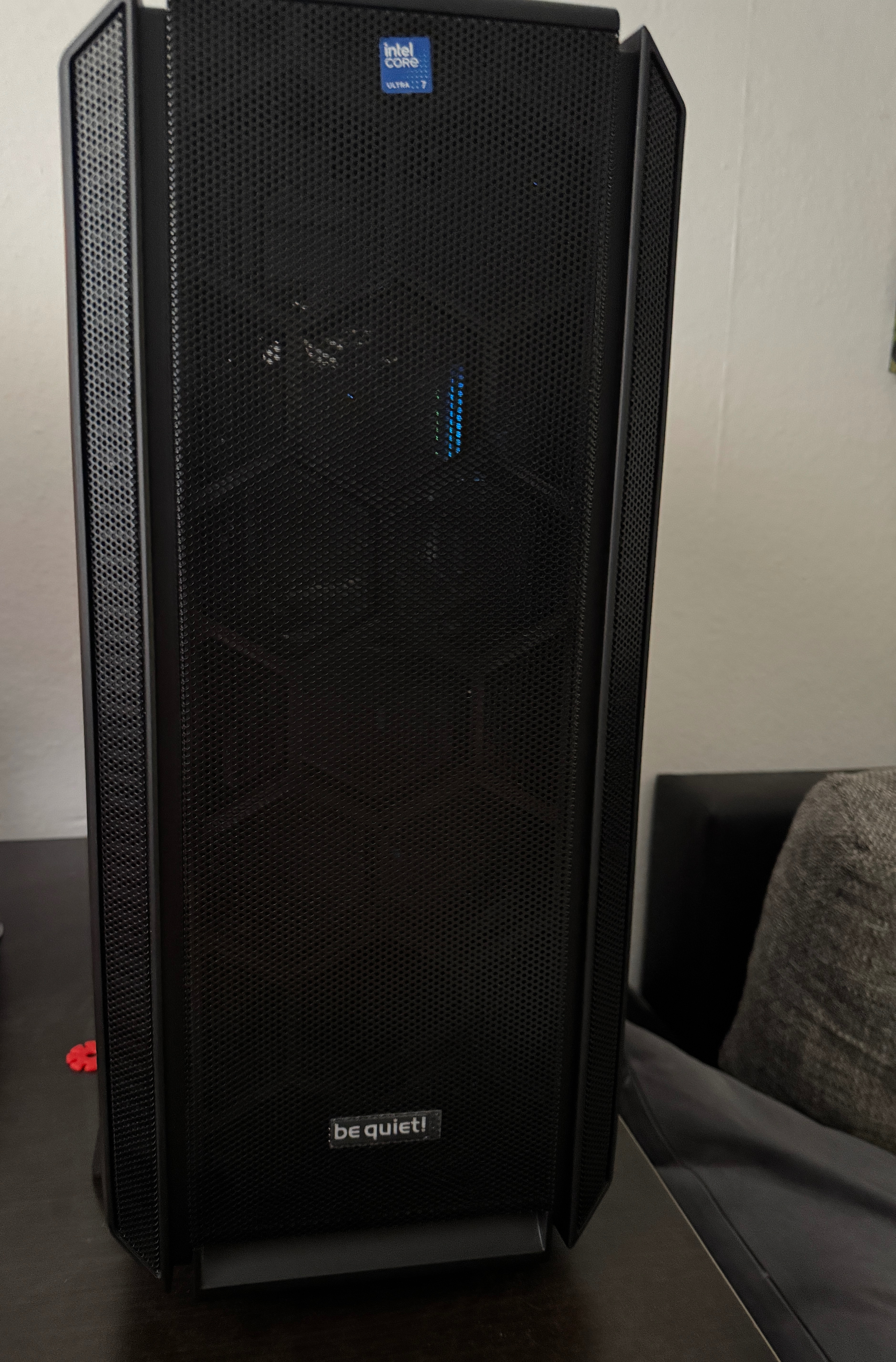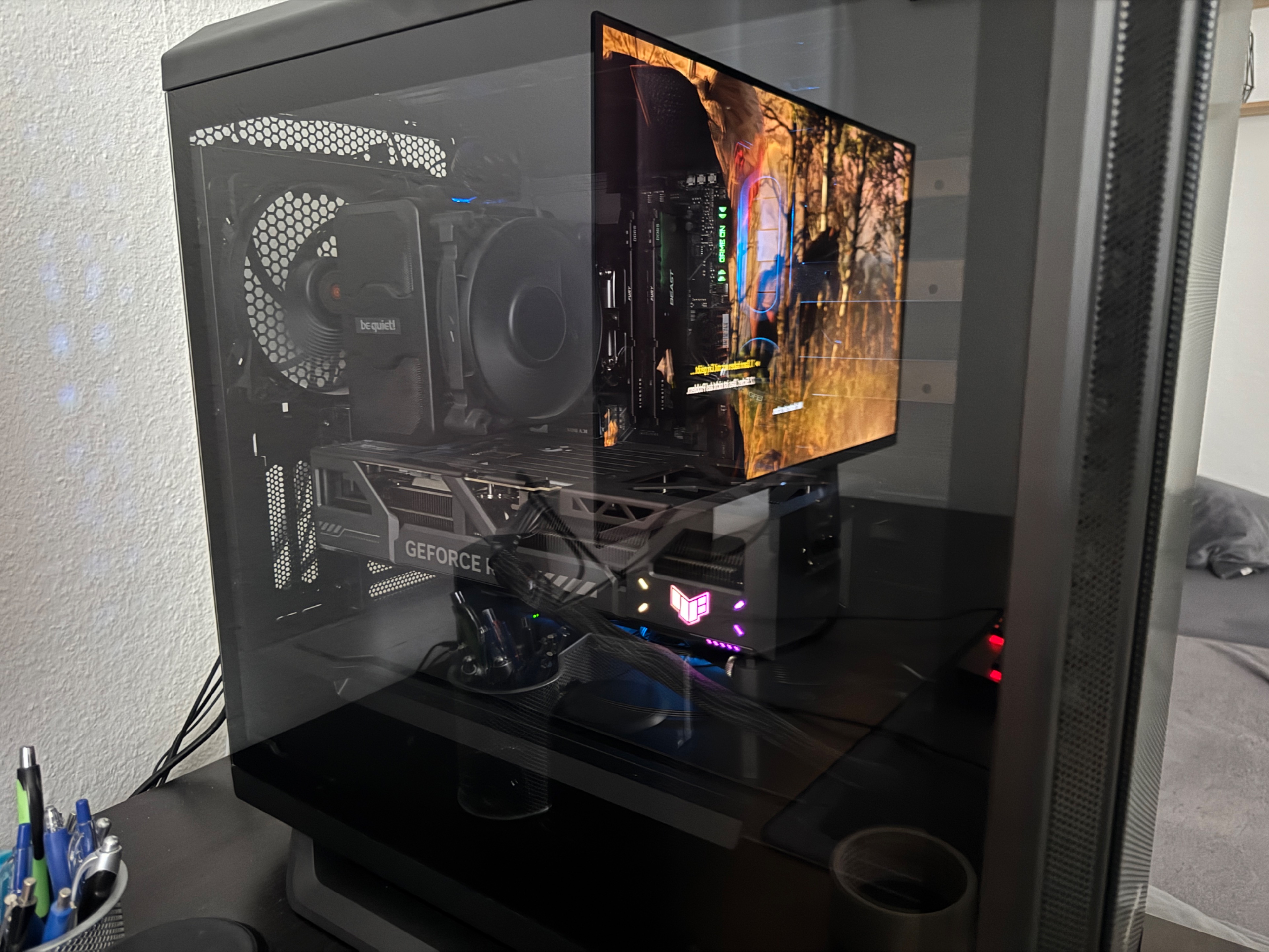 Standard ist ja P-Mode eingeschaltet. Beim zocken, weil ja das Gehäuse auf dem Schreibtisch steht, wird die Grafikkarte richtig laut beim zocken, dafür sind die Temperaturen bis maximal 76 Grad, weil die Lüfter voll aufdrehen in sehr guten Bereich.