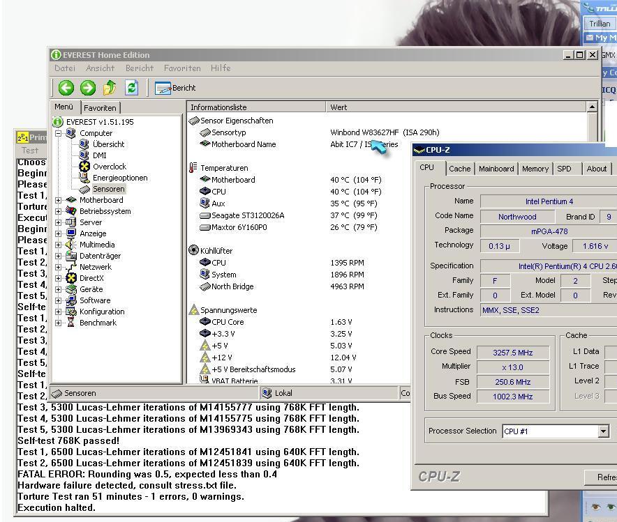 wie ich vorhin geschrieben hab, hab ich prime95 laufen lassen. hab auch einen entsprechenden screener gemacht. dabei hab ich wie gesagt nicht den test small ffts sondern halt den nächsten laufen lassen. und dieser ist, wie man auf dem screener sehen kann, nach 51 minuten abgebrochen worden aufgrund eines fehlers. welche konsequenz muss ich nun daraus ziehen? muss ich überhaupt? ist diese zweite testart für mein oc-vorhaben überhaupt wichtig? wenn es wichtig ist, was kann ich verändern bzw. was sollte ich verändern?