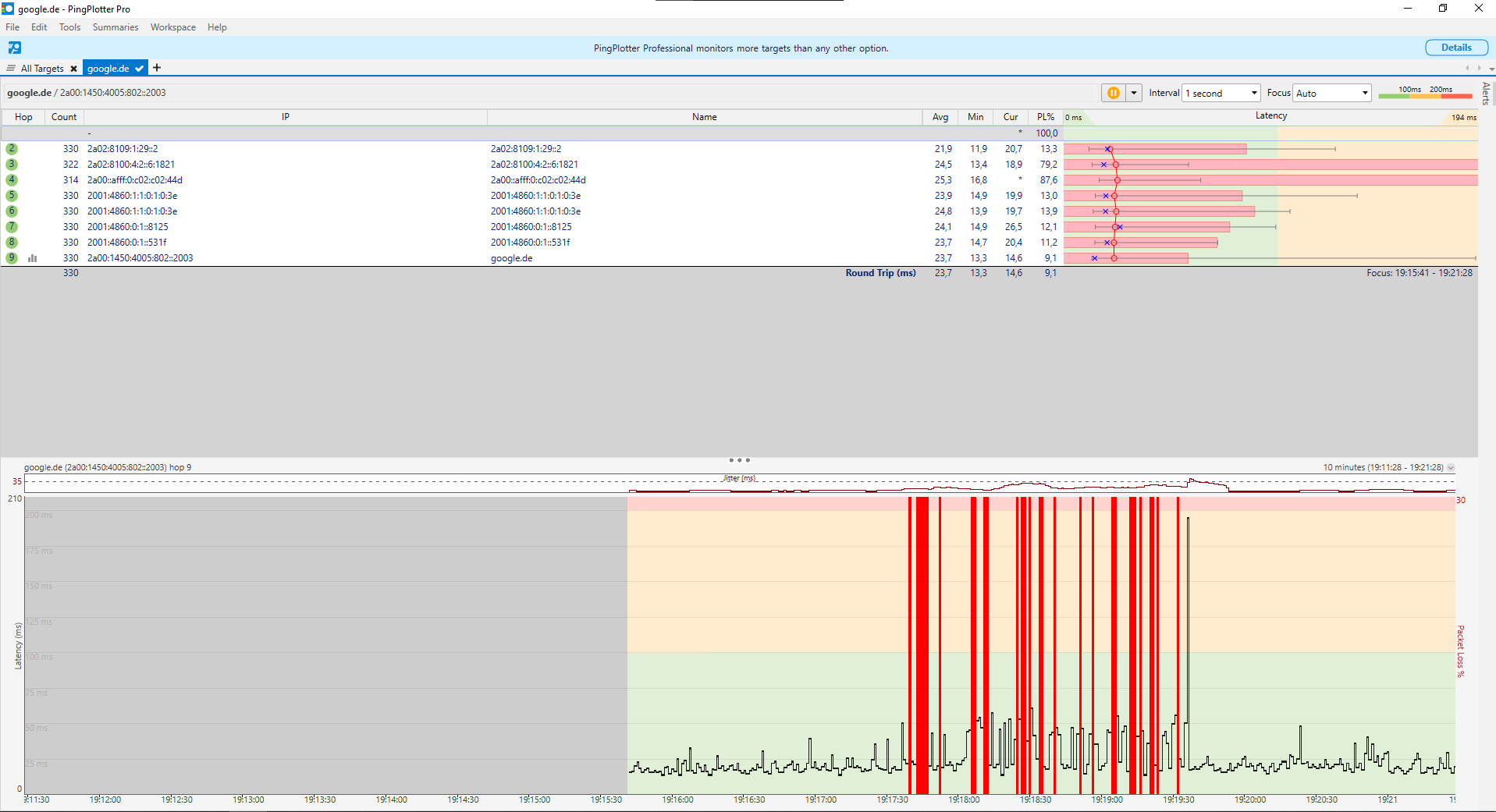 ich beziehe seid Anfang des Monats Kabel Internet Über das Vodafone Netz und habe mit schweren Paketverlusten zu Kämpfen und wollte wissen ob mir hier jemand helfen kann meine Gemessenen Ergebnisse von Pingplotter richtig auszuwerten so wie ich das sehe liegt der Paketverlust auf seiten des Anbieters