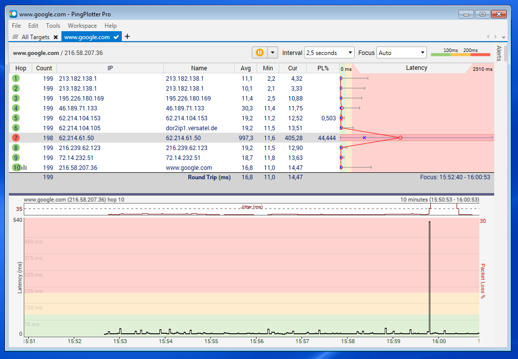 Ich habe mit dem Programm PingPlotter 5 ein par Messungen gemacht aber mir sagt das nicht fiel