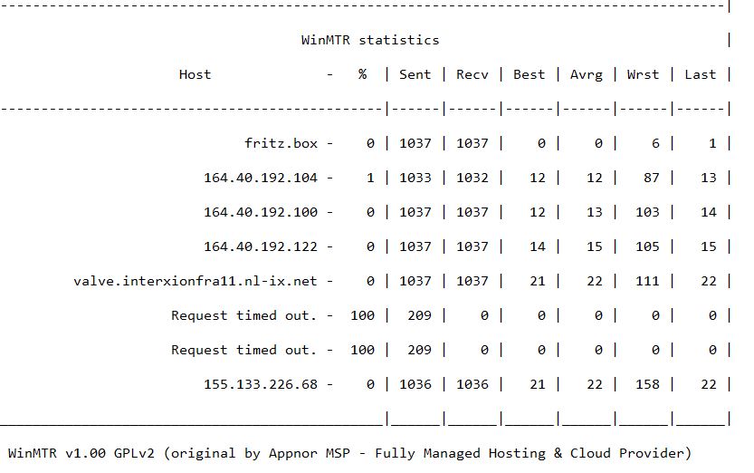 Richtig, der mtr ist absolut sauber. Und den hast du aufgezeichnet, während es Probleme gab?KaPutty schrieb:die habe ich dann anschließend gut 1000 mal mit MTR angepingt. Mit 0 Loss am Ende. Allerdings gaben 2 Stellen ein "Request timed out" an, das tut aber denke ich mal nichts zur Sache, so lang das Ziel am Ende ohne Loss angepingt werden konnte, richtig ?