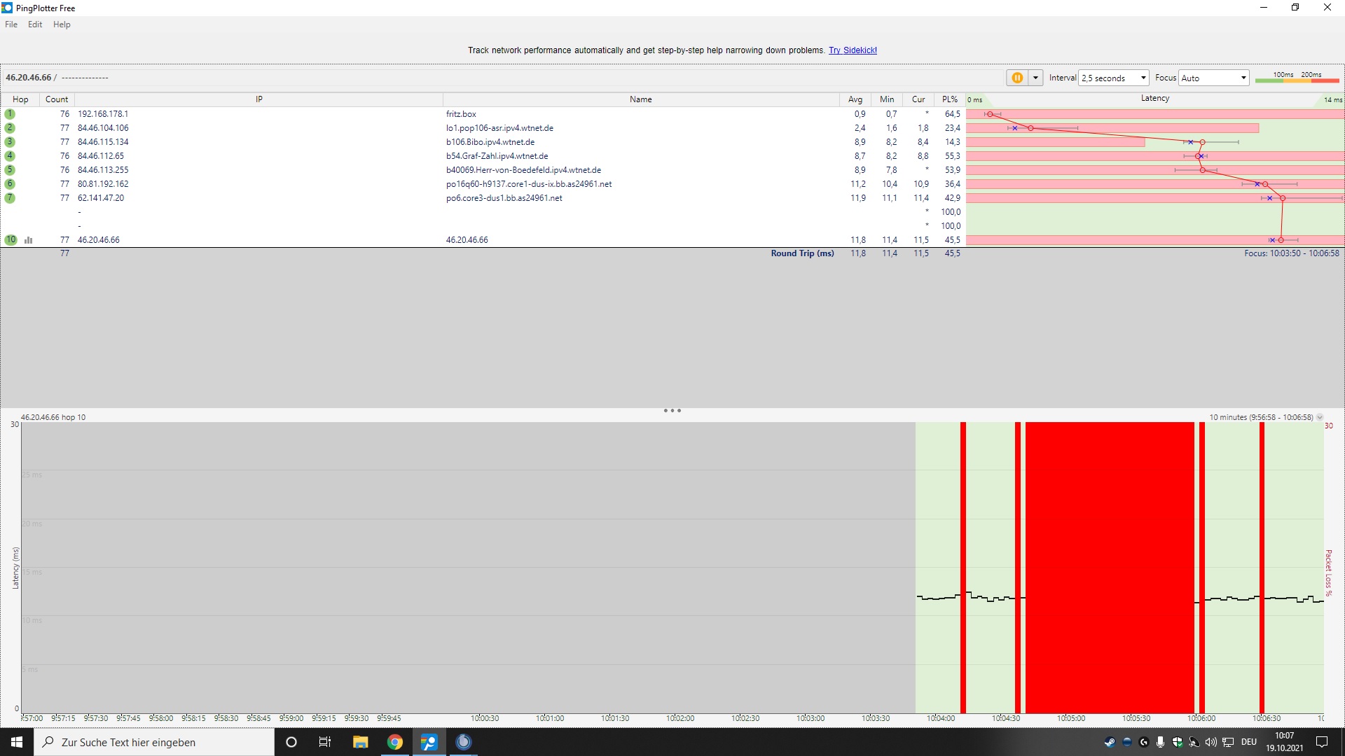 1. Pingplotter nutzen um herauszufinden wo der Paket loss Auftritt... tracert ist zu sporadisch...und wenn haben wir genau da keine Infos von dir.