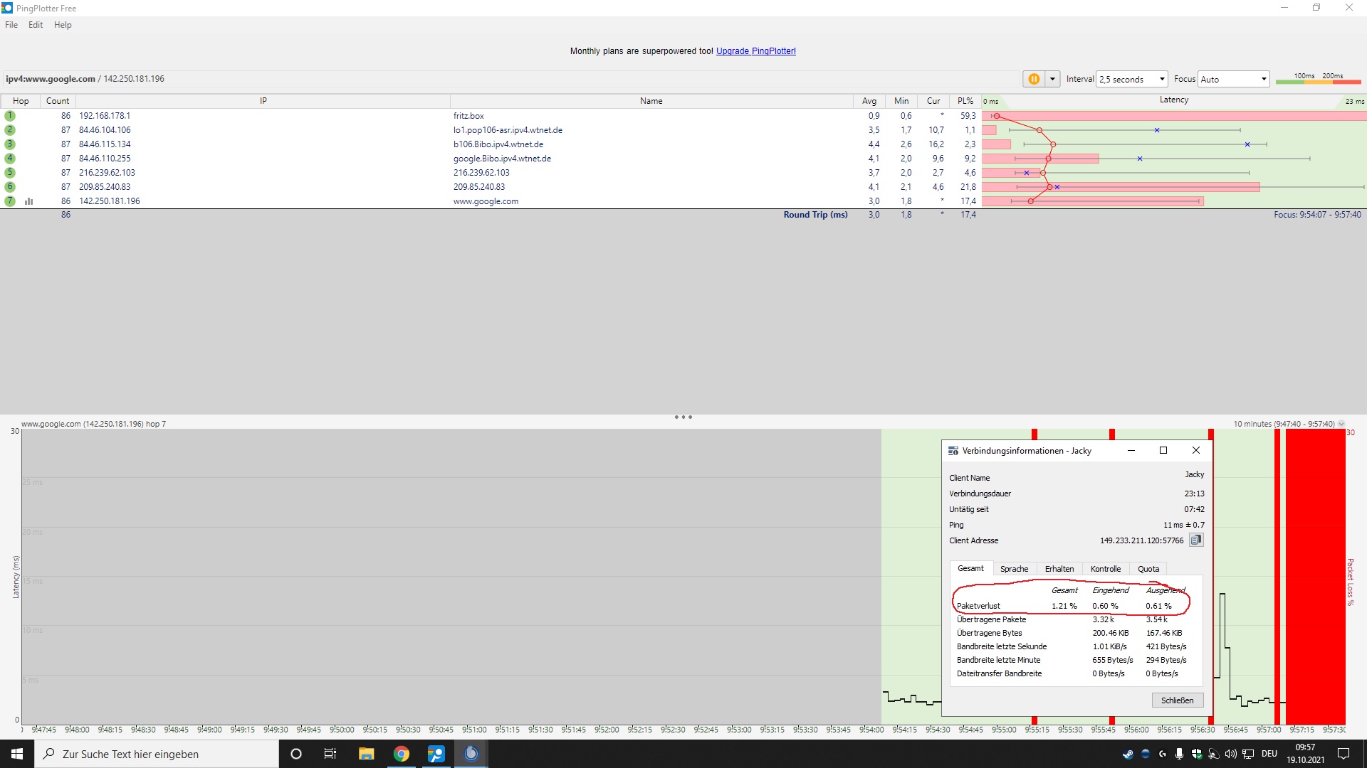 Im Teamspeak, CS:GO, Fifa und diverse bekannte Seiten sind durchgehend Paketverluste.