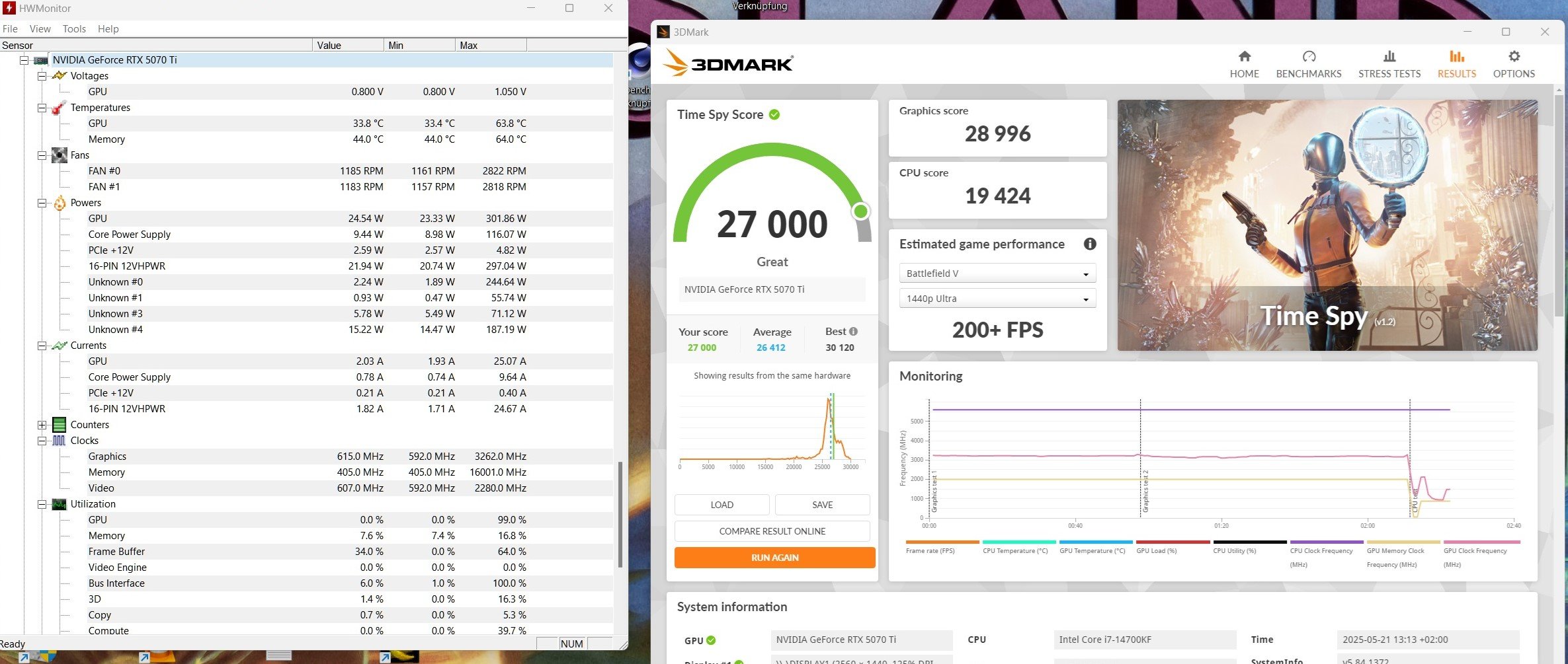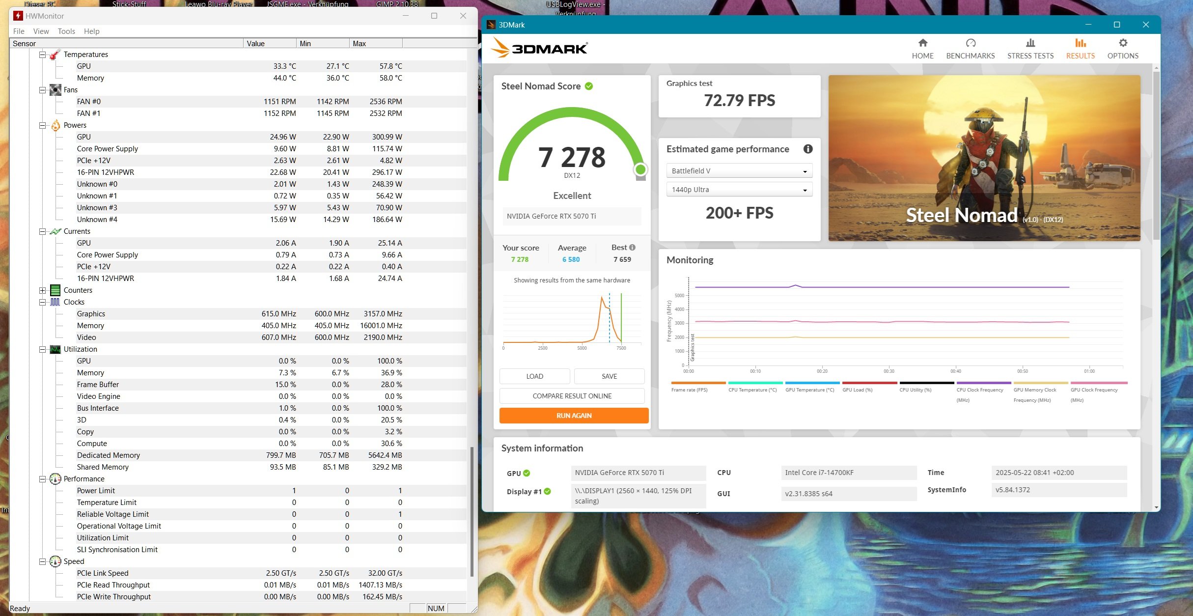 In Baldur's Gate 3 bei 1440p/Ultra/DLAA gab's selbst mit UV-Profil deutlich mehr FPS. Im wohl heftigsten Szenario im Spiel (Akt III Lower City) kam ich mit der 4070S auf gerade mal 90 FPS max (gerne auch mal bissl weniger) und die 5070 Ti schaffte hier konstante 120 FPS. Im deutlich weniger fordernden Akt I schafft die Karte auf Default ziemlich locker 165 FPS.