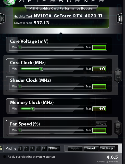 Wie ich feststellen muss, kann ich diese nicht anpassen. Im MSI Afterburner ist der Regler ausgegraut. Im Thunder Master Tool ist die Aktion zwar aktiv, jedoch ändert keine der Einstellungen etwas.