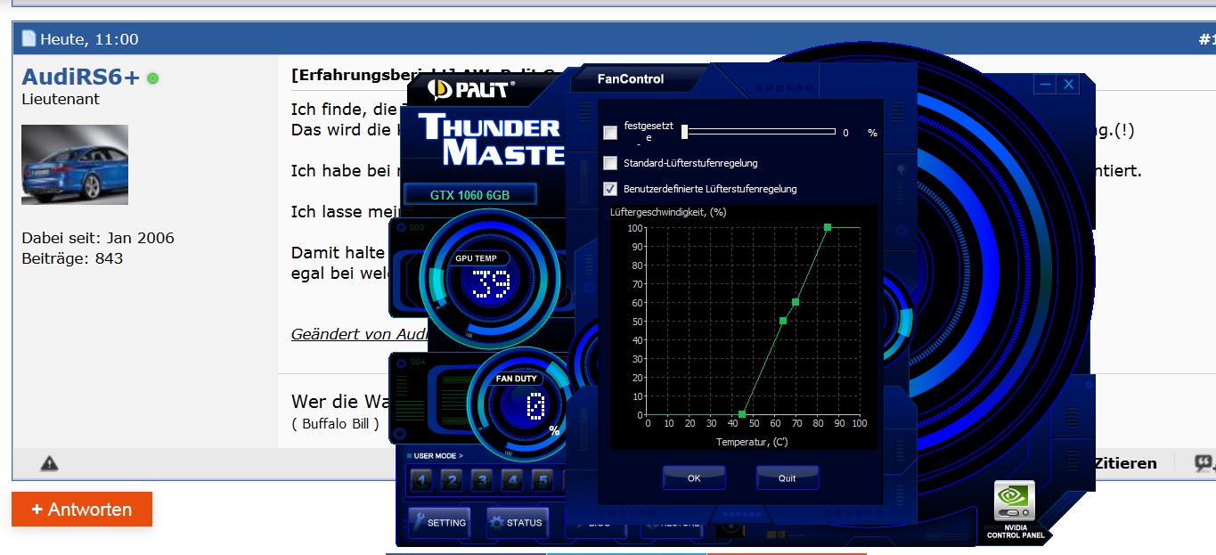 Mit 116% Power-Limit und Übertaktung, lief der Lüfter dann auf bis zu 70% (im Benchmark) und war damit hörbar.