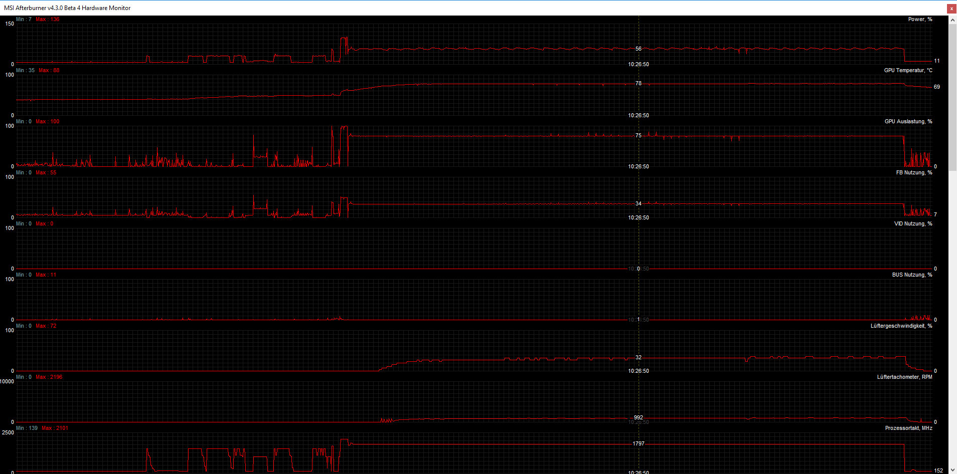Übertaktet habe ich die Karte nur ganz normal mit dem MSI-Afterburner. Ich kann dabei das Powerlimit um 16%, den Standard/Boost-Takt um 250 MHZ und den Speichertakt um 450 MHZ anheben. Das Powerlimit liegt damit dann bei 140 Watt, was auch für die erhöhten Taktraten wiederum in 95% aller Fälle ausreichend ist (und in den 1% der Fälle drosselt die Karte auch nur um weniger als 5% -> somit reicht das Powerlimit gefühlt für 99,75% der Maximalleistung). Es wird damit dauerhaft ein Boost-Takt von > 2.100 MHZ gehalten. Die Lüfter drehen hier jetzt auf bis zu 70% und sind aus geschlossenem Gehäuse, hörbar.