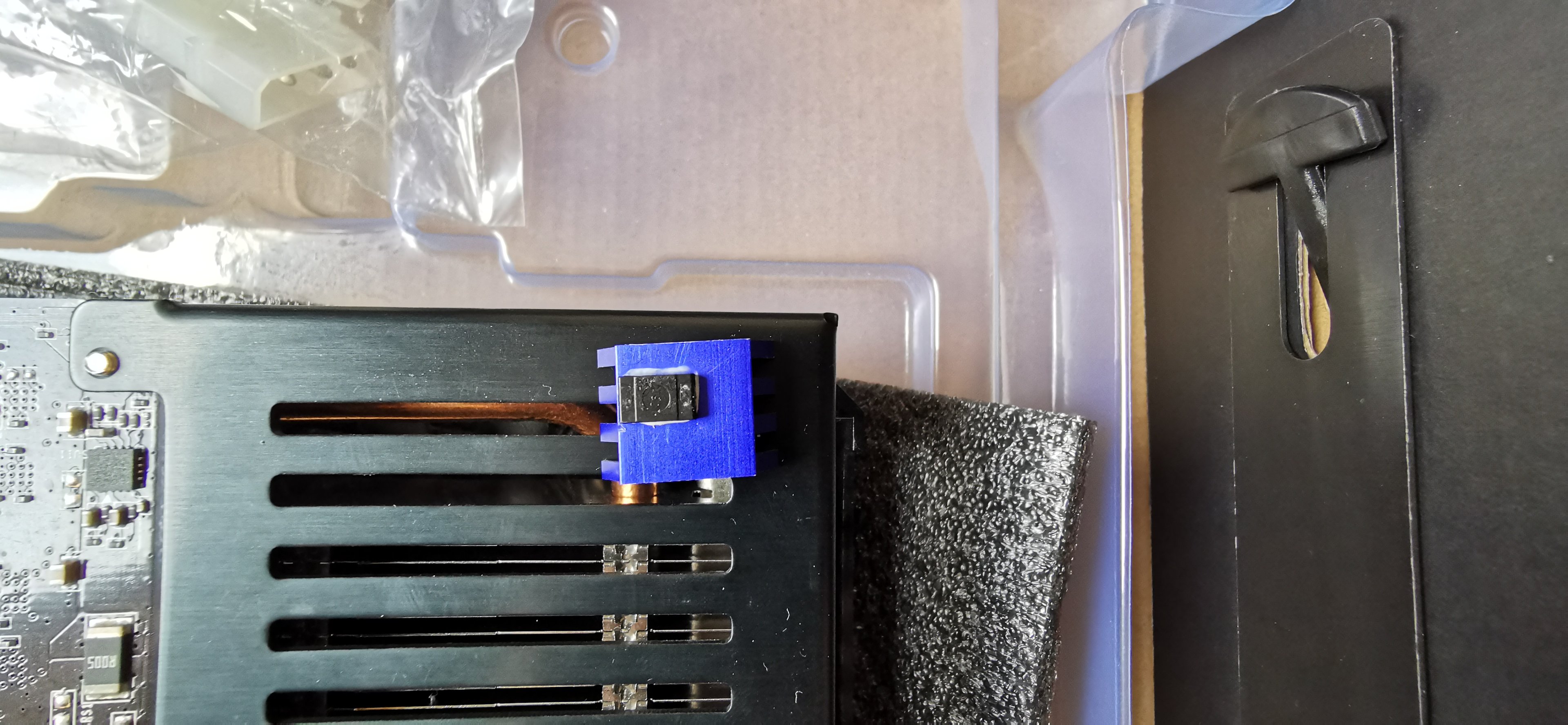 Der Vorbesitzer hat irgendwelche Kühlkörper auf verschiedene Bauteile geklebt und leider wurde sie beim Versand nicht richtig verpackt, somit ist beim Transport der Baustein abgebrochen.