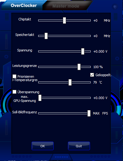 Ich habe mir jetzt mal das Overclockingtool von Palit, ThunderMaster, heruntergeladen, vielleicht bringt ja "underclocking" um ein paar Prozente etwas, hier bräuchte ich jedoch Hilfe welche Werte ich verändern sollte. (andererseits läuft Furmark im Fenstermodus mit MaxLast ohne Probleme)