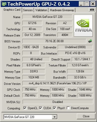 Palit/XPERtVision NV GF GT 220 1024 MB DDR 3 RAM