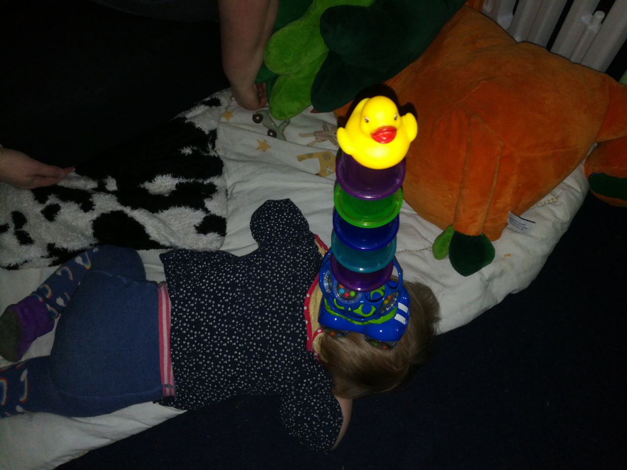 Anbei noch ein Quatschbild von heute... die kleine ist im Garten umhergeflitzt, Oma und Opa waren da und nun war sie lange vor dem Abendessen so platt, dass sie im Laufställchen eingepennt ist - die Chance für Papa, einen neuen "Was kann man alles auf Baby stapeln, ohne, dass es umfällt"-Rekord aufzustellen