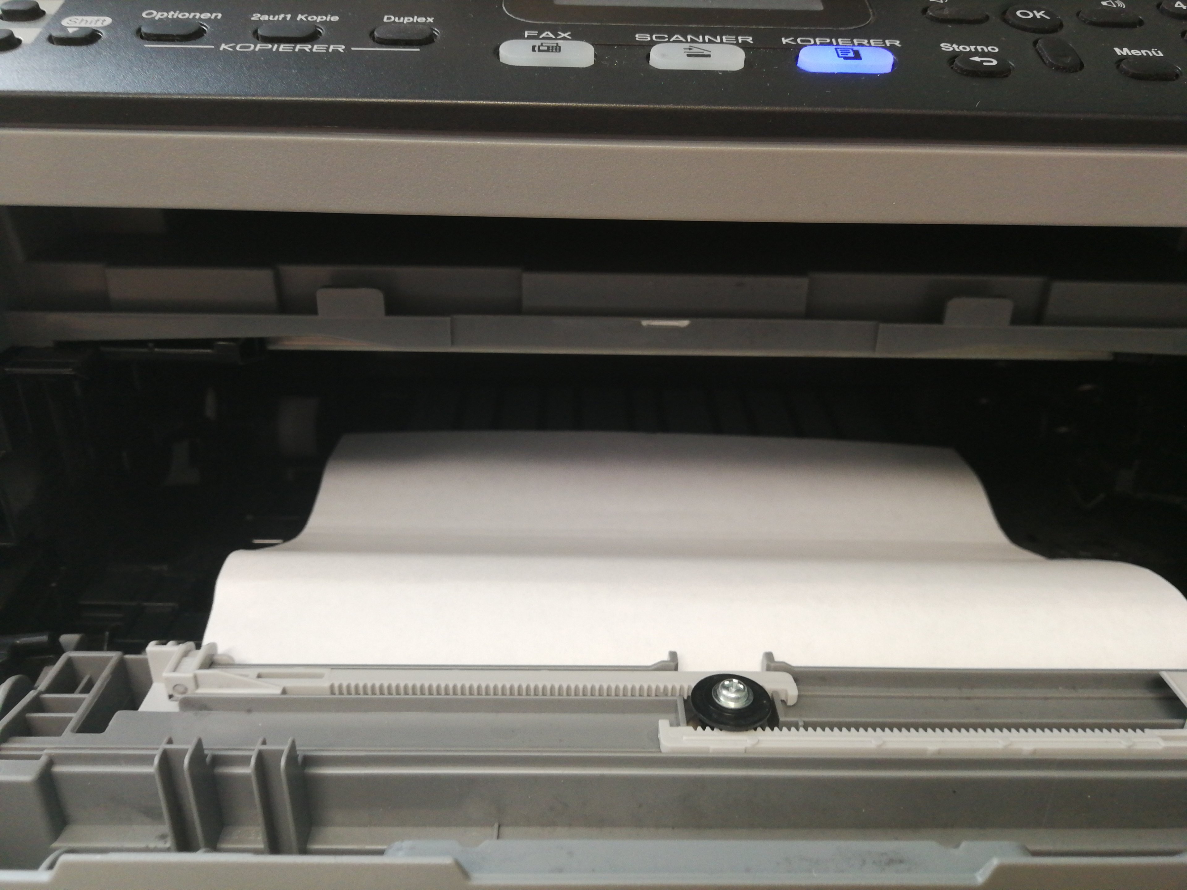 Das Gerät meldet bei jedem Druck-/Kopierversuch "Papierstau innen". Dabei ist es egal, ob das Papier über die Umlenkrollen aus dem Papierfach kommt oder über den manuellen einzug von vorn zugeführt wird.