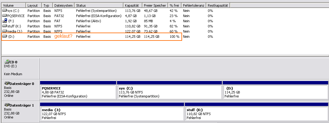 Nachdem er dann endlich wieder oben war, Wurde die 2 TB Partition auch wieder erkannt und ich kann sie ohne Probleme verwenden. Die andere Partioion wo sich glücklicherweise noch keine Daten drauf bestanden, steht zwar im Explorer als "Lokaler Datneträger N" lässt sich aber nicht öffnen. IRgendwann hängt sich der Explorer auf. Da sich keine Daten drauf befinden wollte ich dann formatieren. Also Datenträgerverwaltung geöffnet. Diese lädt sich allerdins auch nicht mehr. Da steht das nicht mit dem Dienst für viertuelle Datenträger kommuniziert werden könne.