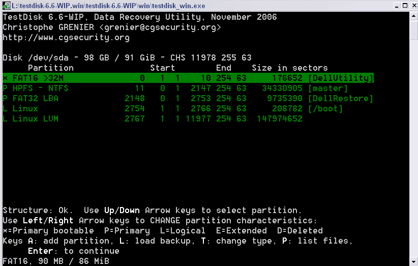 Wenn die Partitionen grün angezeigt werden, markiere die erste Partition Dell Utility und drücke T auf der Tastatur.
