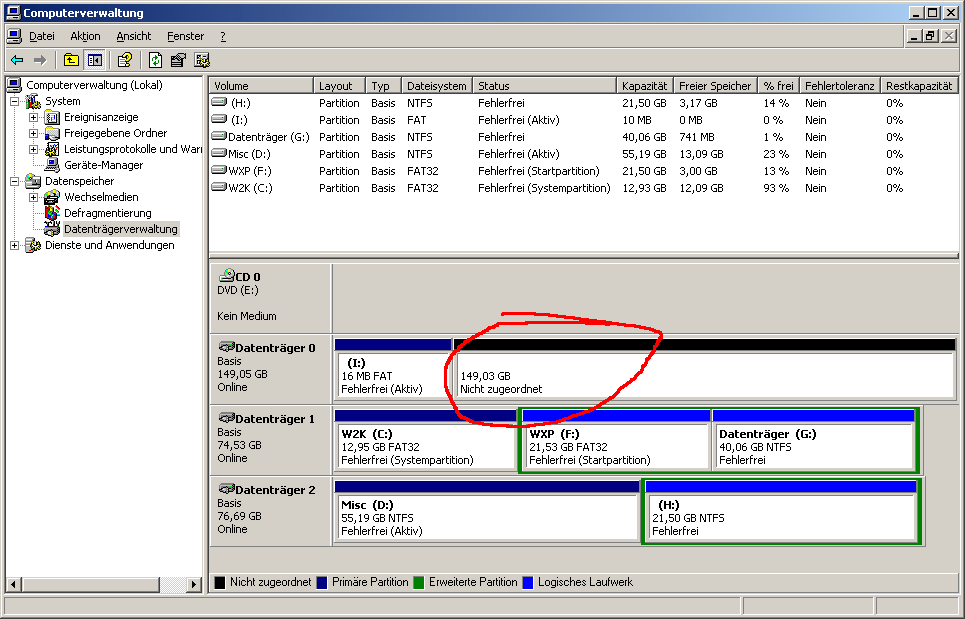 Nachdem ich dann mit FIXMBR und FIXBOOT aus der Wiederherstellungskonsole alles soweit wieder gerichtet habe, habe ich meine alte Installation gestartet und zu meinem Entsetzen feststellen müssen das meine 160GB Platte nur noch mit 10MB dargestellt wird.