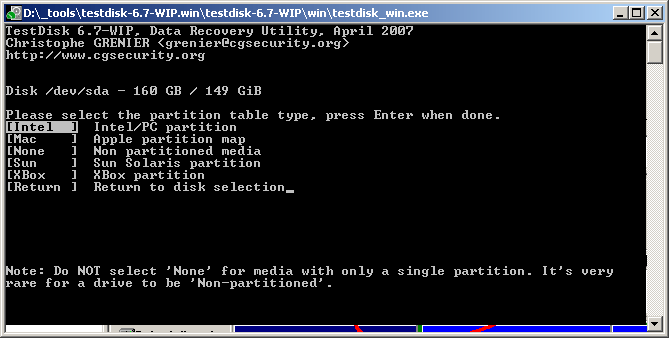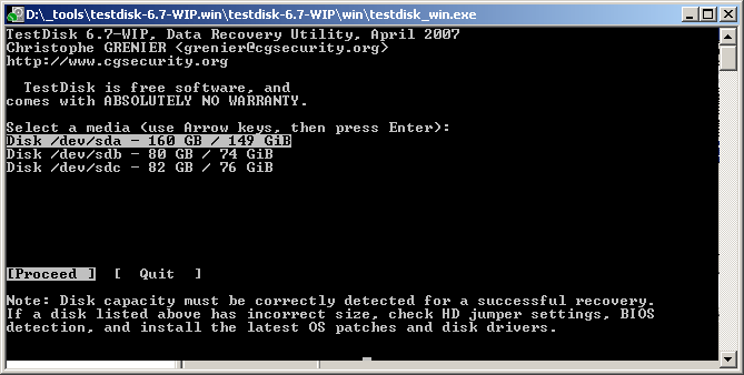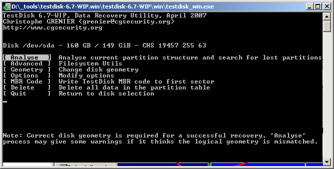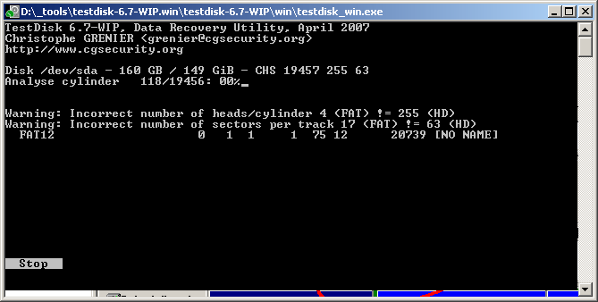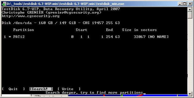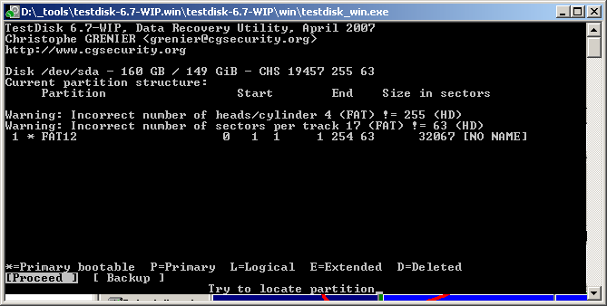 (Zusätzlich steht ganz unten: "NTFS found using backup sector!, 160 GB / 149 GiB")