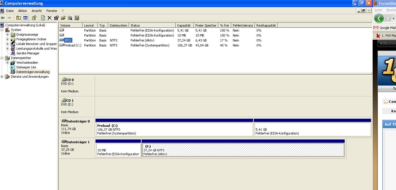 Die Fesplatte habe ich ausgebaut und über einen usb-Adapter an meinen neuen Lappi angeschlossen. Das Problem ist, das ich nur die Partition 1. sehe, also nicht meine Daten Partition. Unter Eigenschaften von der Platte wird mir die richtige größe (ca.40GB) angezeigt.