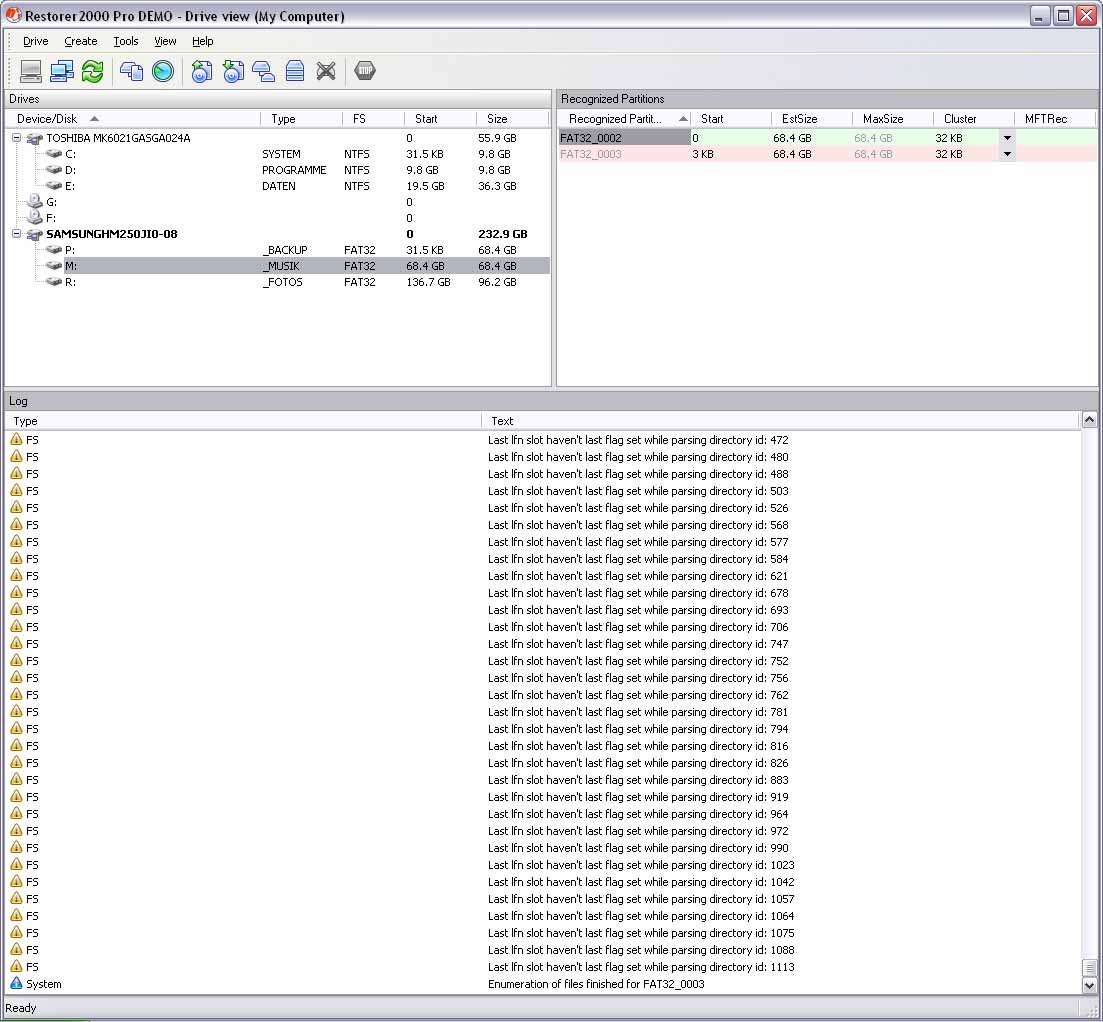 Als ich mit dem MacBook auf eine der Partitionen zugriff, meldete der Recher plötzlich, das Volume sei unzulässig entfernt worden. Die Partitionen verschwanden im Finder, die Festplatte war aber weiter über USB verbunden, die entsprechende Diode am ToughDrive leuchtete. Nachdem ich sie dann entfernte und wieder anschloss, waren die Daten auf einer der drei Partitionen (M: - nicht diejenige, auf die ich zuletzt am MacBook zugegriffen hatte) vollständig verschwunden. Alle drei Partitionen hatten außerdem ihre Namen verloren. Aber auf zwei der drei Partitionen sind alle Daten unverändert und unbeschädigt.