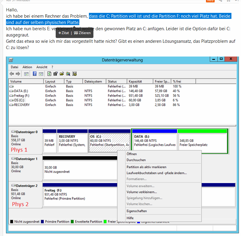 Ich habe nun bereits E: verkleinert und wollte den gewonnen Platz an C: anfügen. Leider ist die Option dafür bei C: ausgegraut.