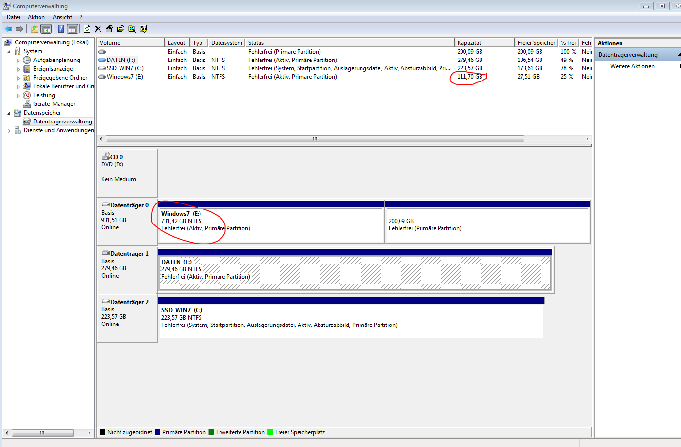 Im Explorer, in den Eigenschaften und der Datenträgerverwaltung (oben unter Volume) steht sie jedoch nur mit 111 GB drin. Unten bei Datenträger steht sie jedoch wieder mit 731 GB. Es gibt auch keine unformatierte oder nicht zugeteilte Partition.