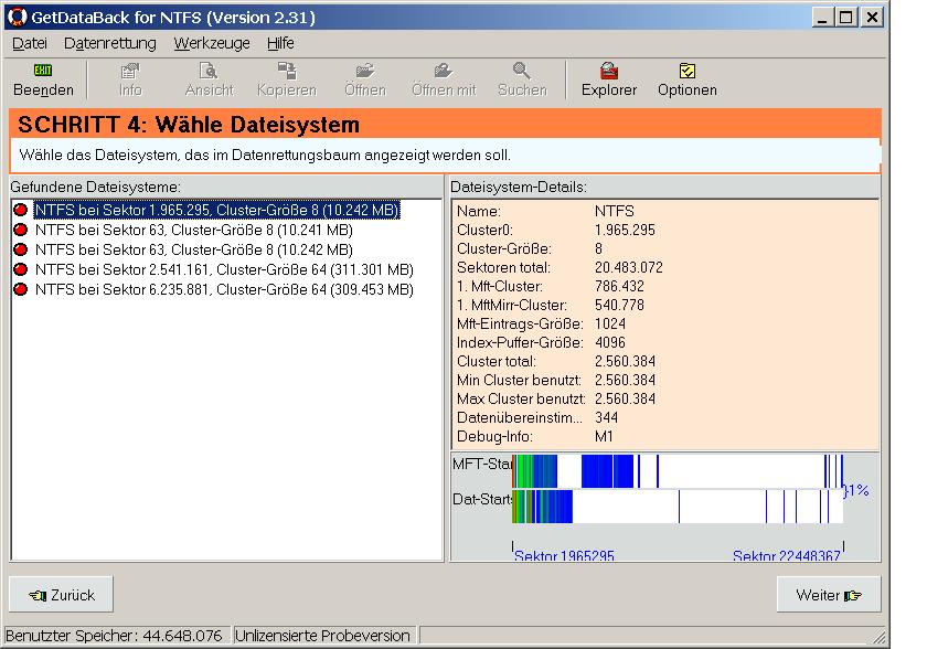Hinterher kannst du oben im rechten Fenster in Restorer auf die Festplattensymbole (erkannte Partitionen) klicken und auf deine Daten untersuchen.