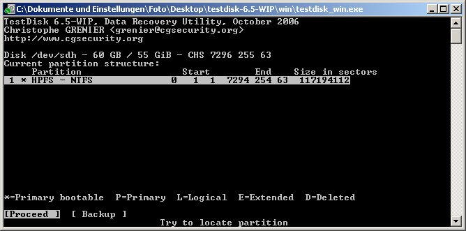 Starte Testdisk bestätige bei dem Log-Datei-Screen mit Enter, wähle deine betroffene Festplatte aus und bestätige mit Enter, bestätige bei Partition Table Typ