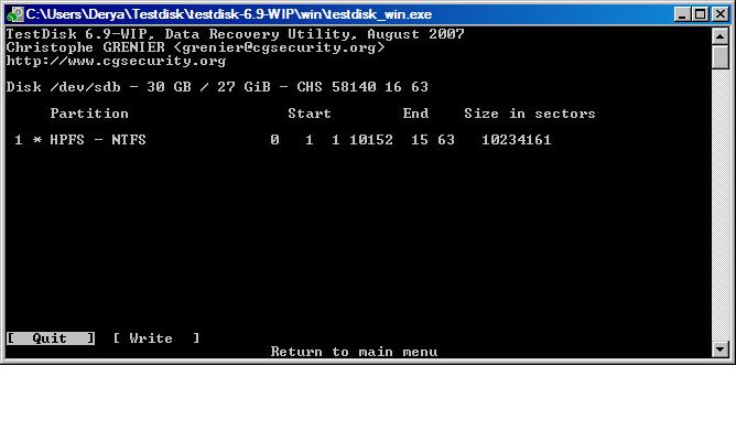 Starte Testdisk bestätige bei dem Log-Datei-Screen mit Enter, wähle deine betroffene Festplatte aus und bestätige mit Enter, bestätige bei Partition Table Typ Intel, bestätige bei Analyse mit Enter und setze mir einen Screenshot.