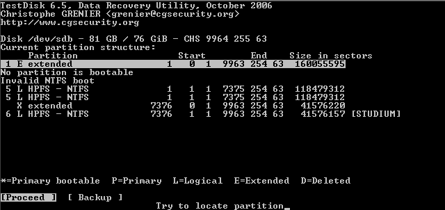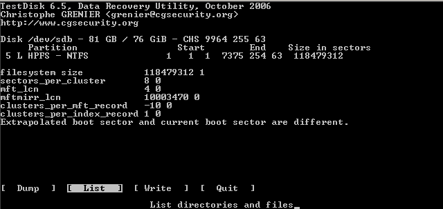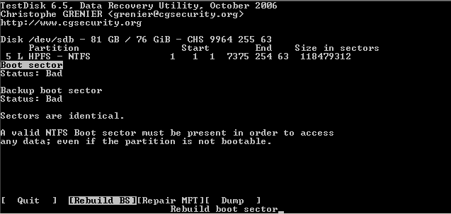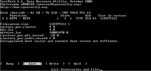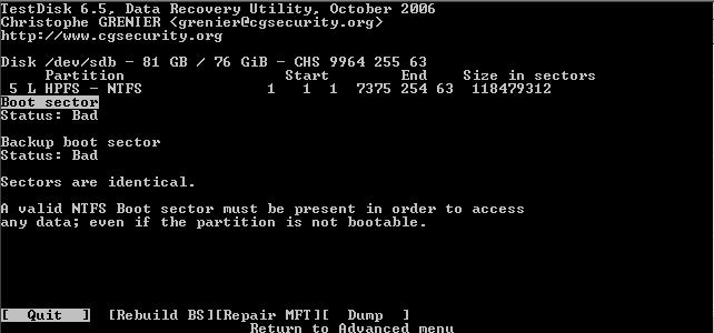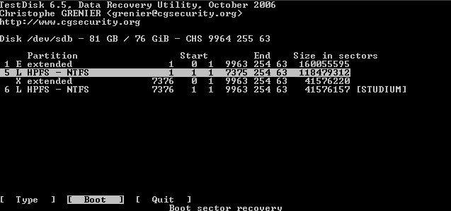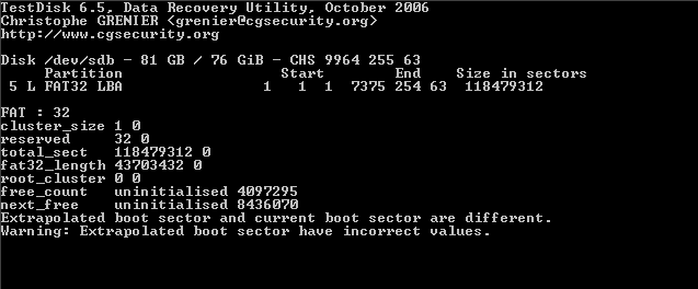 Daher findet Testdisk auch bei einem beschädigten Bootsektor nach der tieferen Suche zumeist die Partition anhand des backup boot sectors.