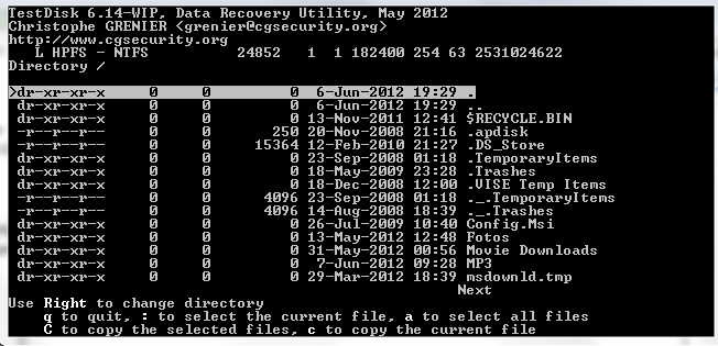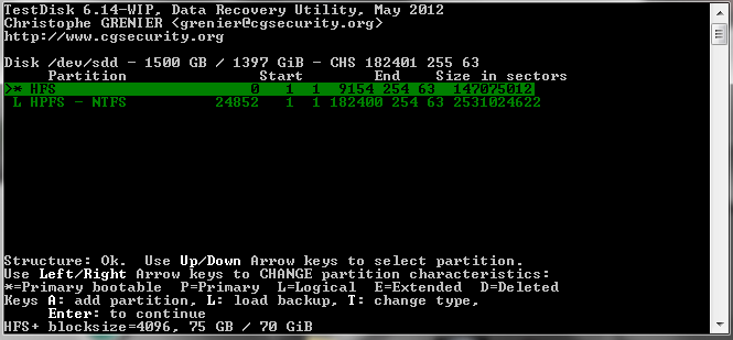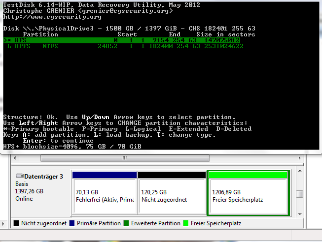 5. HFS Partition ist jetzt nicht mehr verwendbar.....dynamischer Datenträger bringt mich nicht weiter weil ich die HFS wieder haben wollte und die "kleine" NTFS Partition jetzt irgendwie getrennt von der großen war und doch wieder nicht. Deswegen wollte ich das mit TestDisk rückgängig machen.
