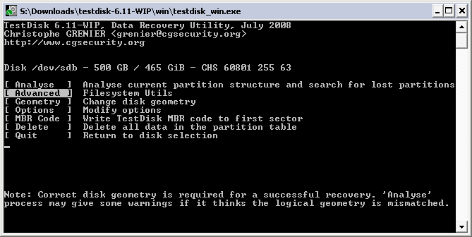 Starte Testdisk bestätige bei dem Log-Datei-Screen mit Enter, wähle deine betroffene Festplatte aus und bestätige mit Enter, bestätige bei Partition Table Typ Intel, bestätige bei Analyse mit Enter und setze mir einen Screenshot.