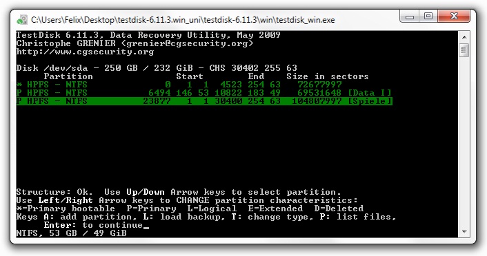 wenn für die TrueCrypt-Partition keine Hoffnung besteht. Wie rette ich die beiden gefundenen, grünen Partitionen?! Testdisk meldet ja keine Fehler in den Bootsektoren oder Ähnliches?! Was müsste ich dort als nächstes machen?