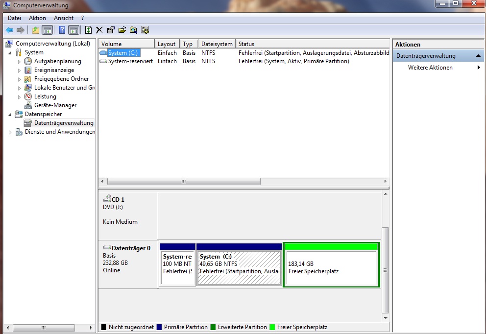 Computerverwaltung/ Datenträgerverwaltung: siehe Anhang (Größe von "C" stimmt nicht mit Testdisk überein, Rest (183GB) ist einfach "Freier Speicherplatz")