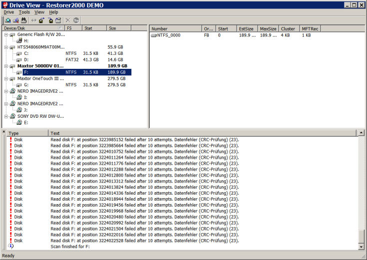 Ich habe nahezu das gleiche Problem mit einer externen HD (Maxtor OneTouch). Ich suche schon alle möglichen Foren ab und habe inzwischen auch schon Testdisk (V6.4) eingesetzt. Leider ohne Erfolg.