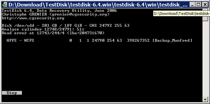 Einige Bildschirmkopien von Testdisk sind beigefügt. Es gab bei "Serach" schon sehr früh eine Fehlermeldung, jedoch kam keine weitere dazu. Leider konnte ich keinen Screen von der abgeschlossenen Suche machen, da das Fenster sofort vom Programm geschlossen wird. Nach der Suche habe ich Write betätigt und danach versucht neu einzulesen. Es kam jedoch Fehlermeldung, dass von Datenträger nicht gelesen werden kann. Welche Möglichkeit kann ich noch versuchen (Platte dient als Sicherungs-HD und Datenträger für Fotografien, Restore wäre also wichtig).