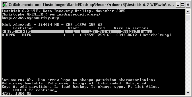Wenn die Partition Unterhaltung (nehme ich mal an da es die einzigste ist die über die gesamte Festplatte geht) deine richtige ist markiere die bitte mal und teile nur mal kurz mit was unten am Screen in der letzten Zeile steht.
